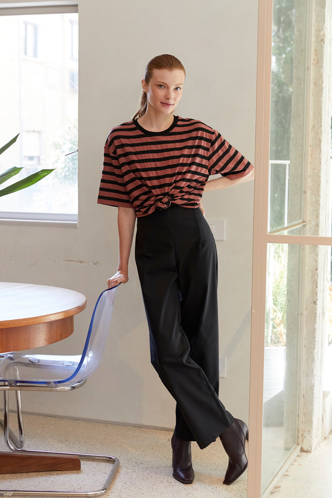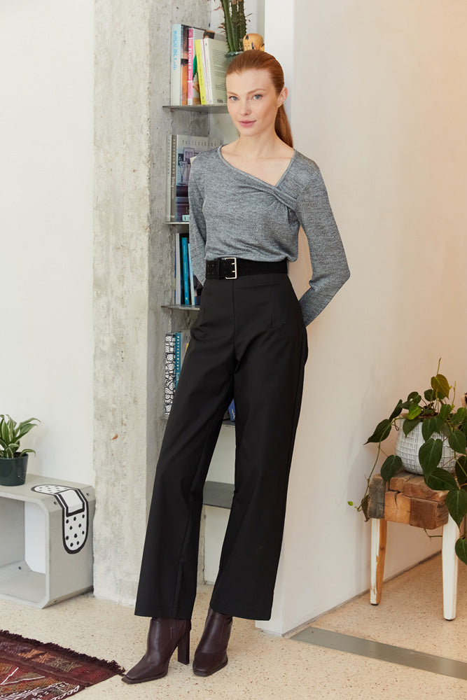 מכנסיים בגיזרה גבוהה ומתרחבת.