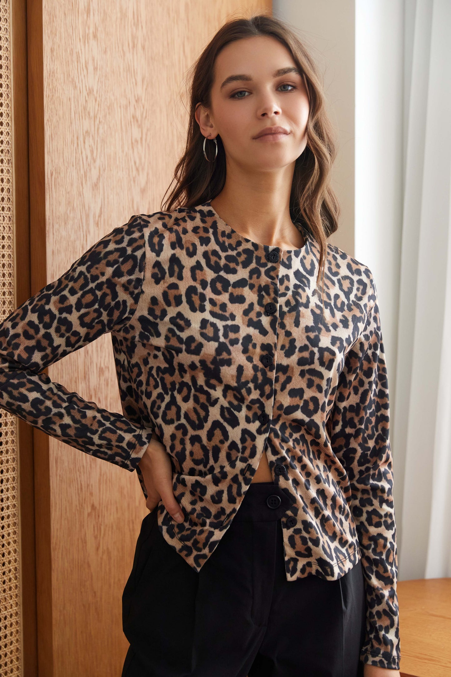 חולצת קרדיגן יפיפייה מבד ריב ויסקוזה לייקרה, בגזרה ישרה.