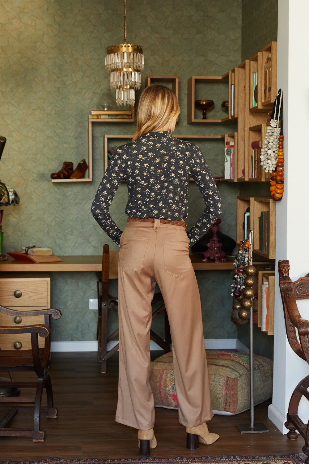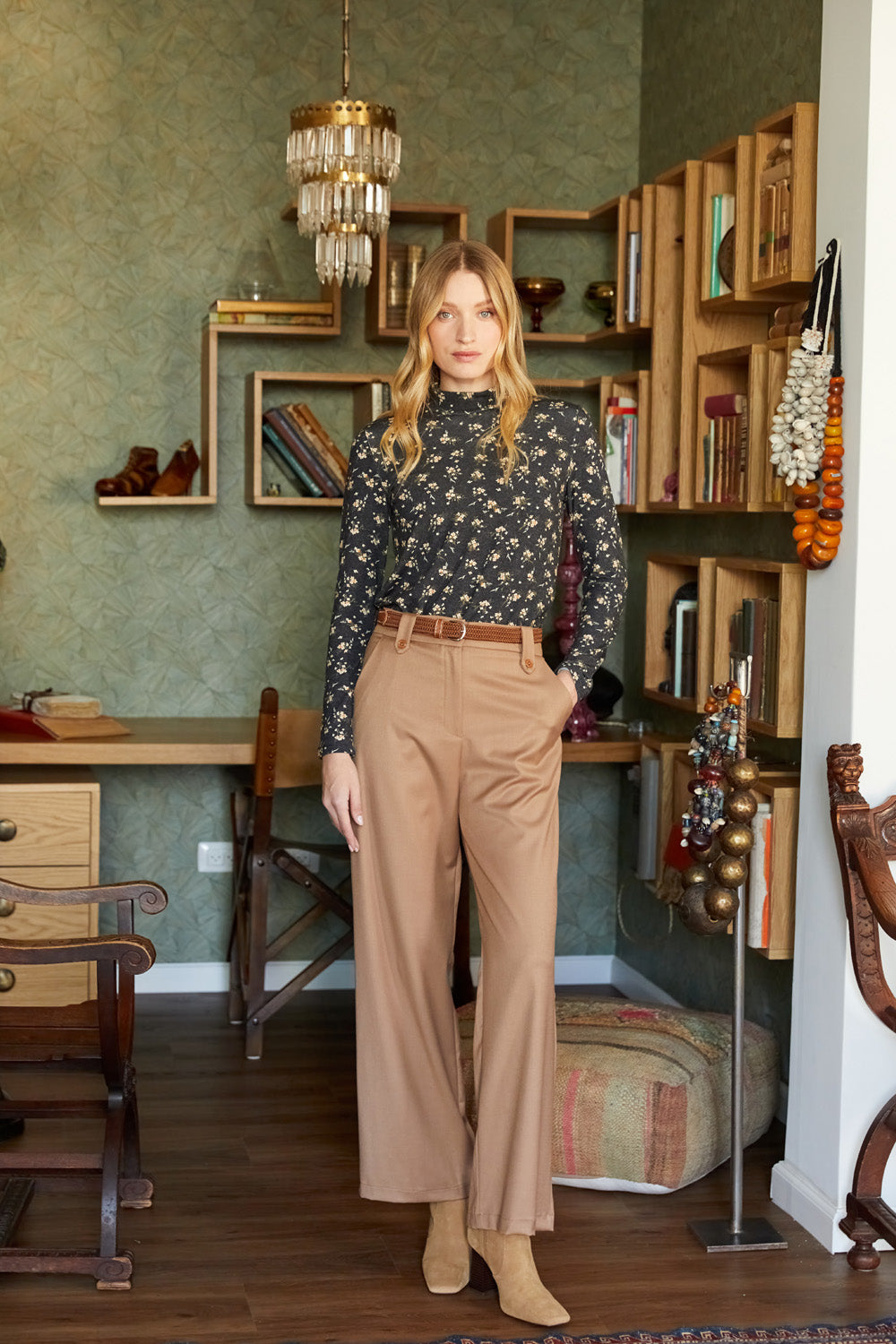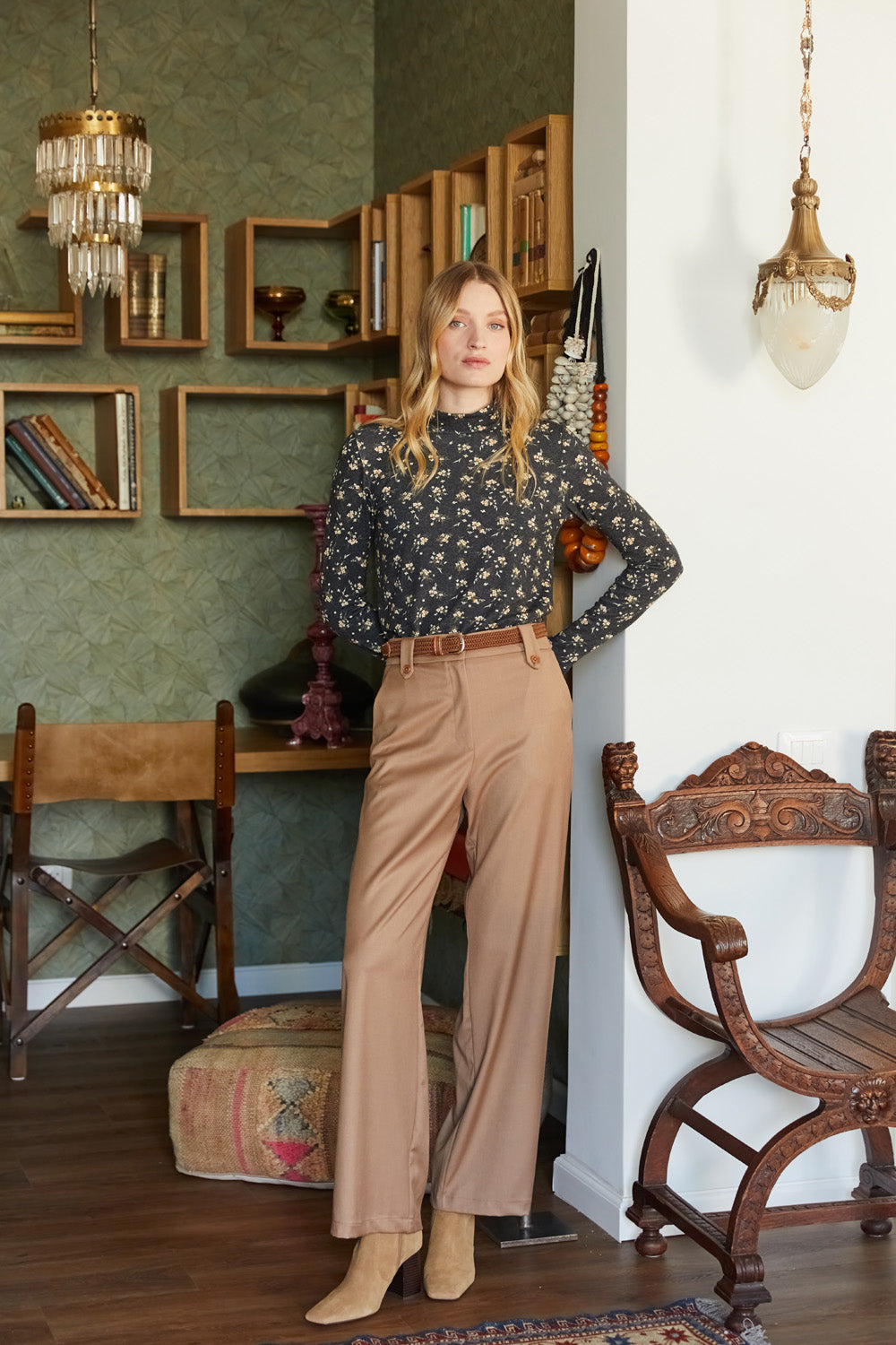 מכנסיים בגיזרה גבוהה ומתרחבת עם לולאות רחבות מעוטרות בכפתורים.