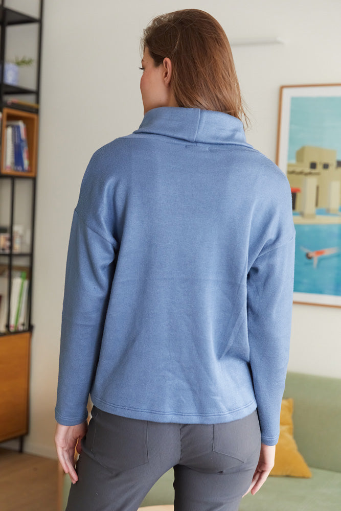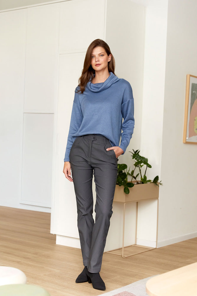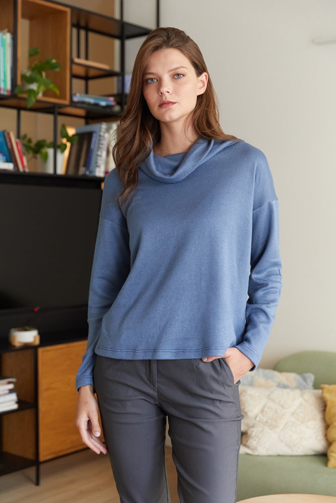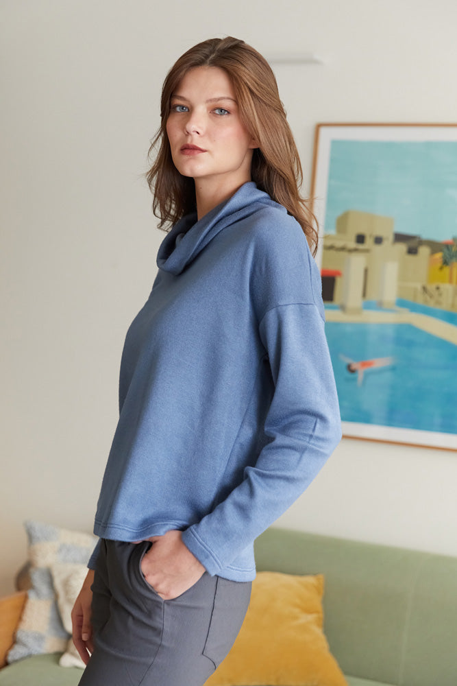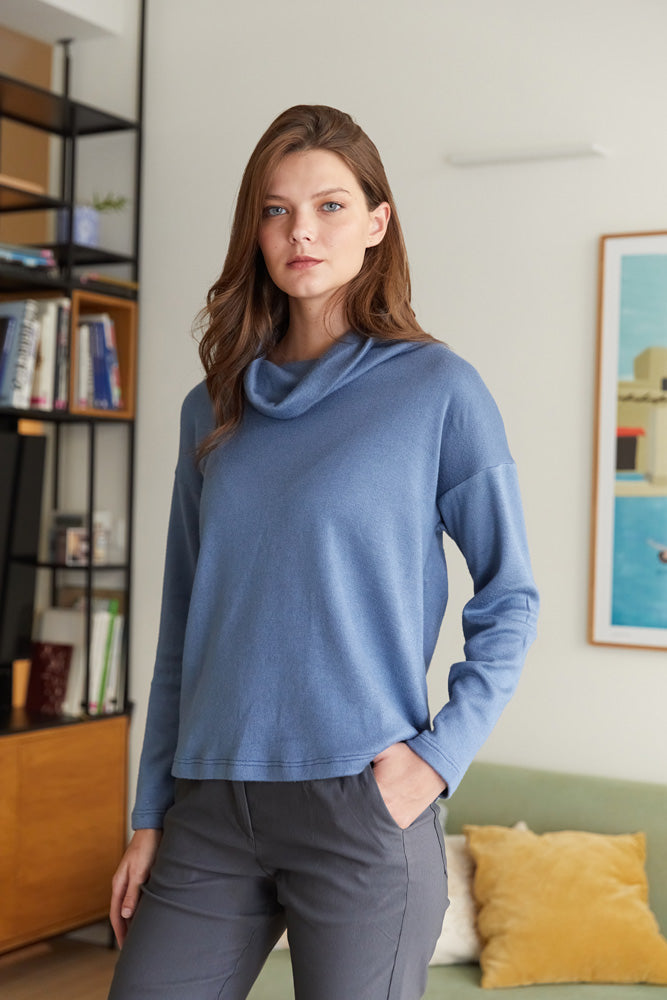 חולצת סריג ויסקוזה בגיזרה ישרה ורחוקה מהגוף עם צווארון נשפך.