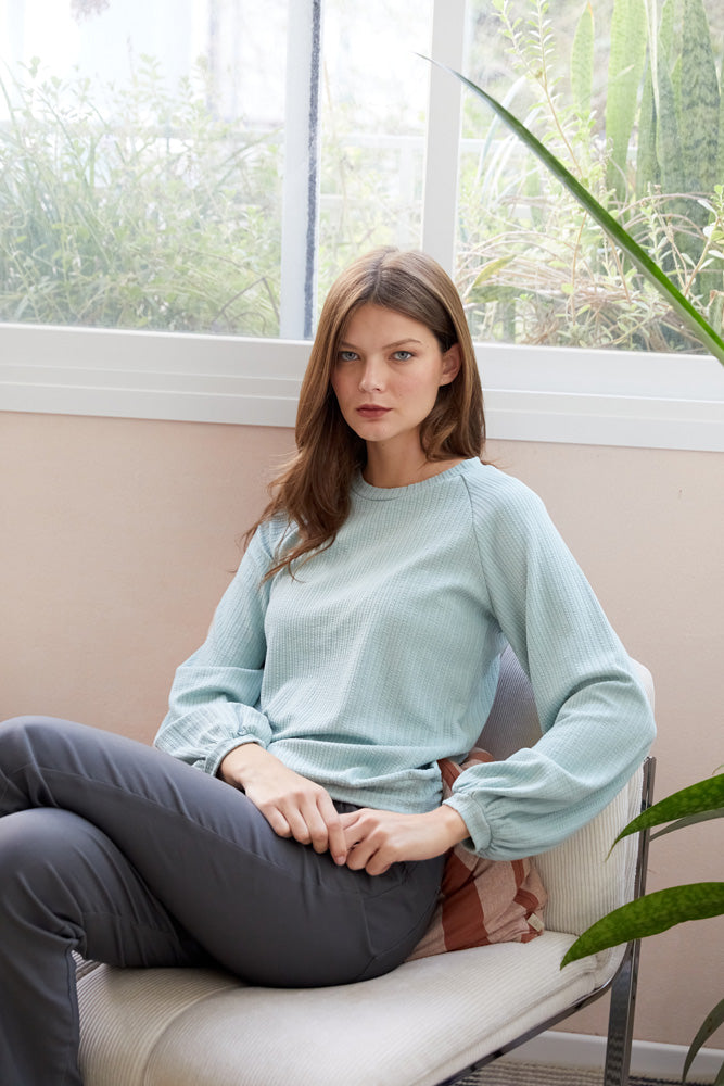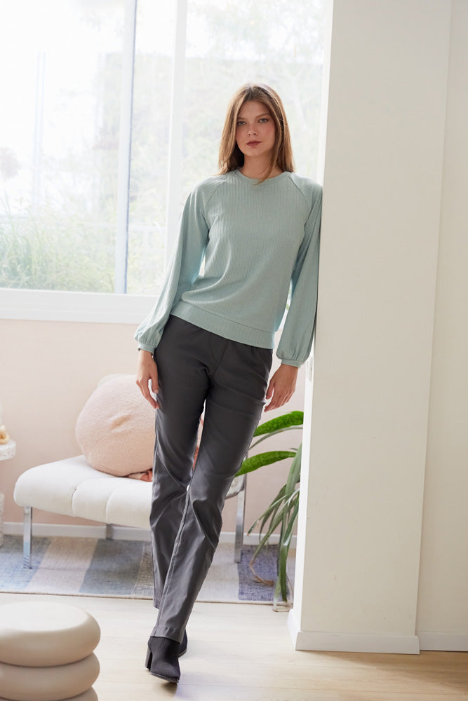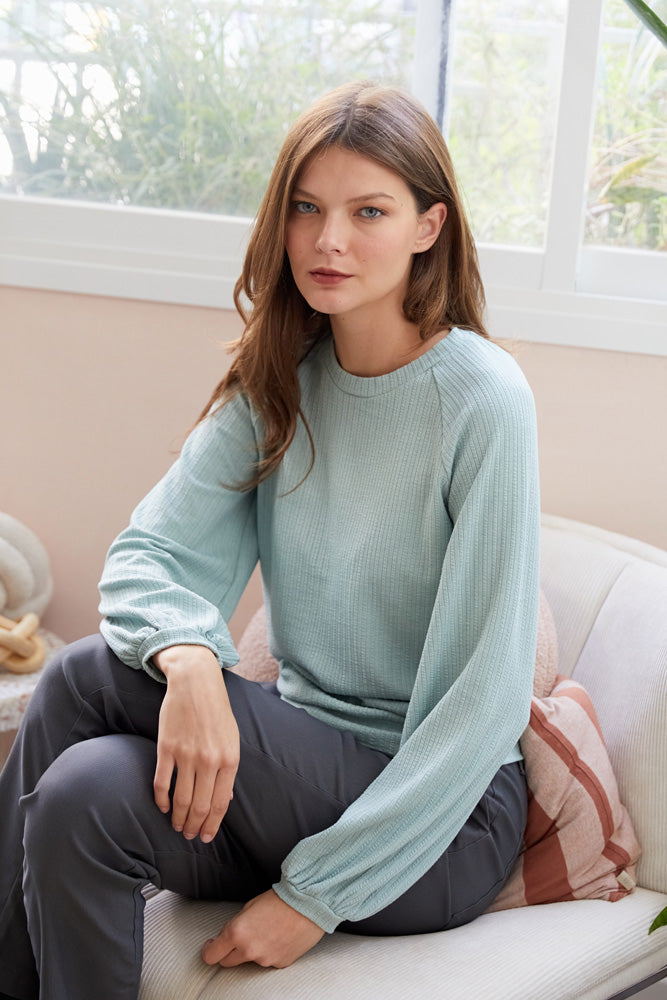 לחולצה מחשוף מעוגל ושרוולי רגלן.