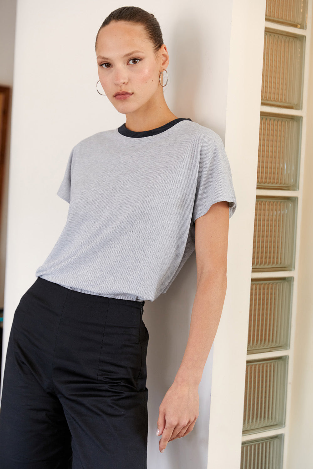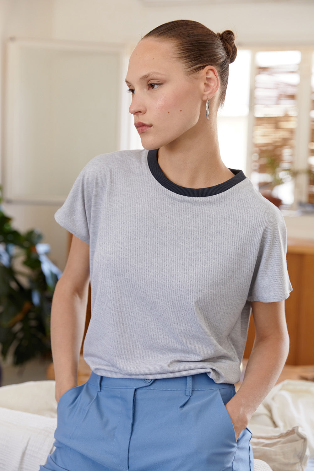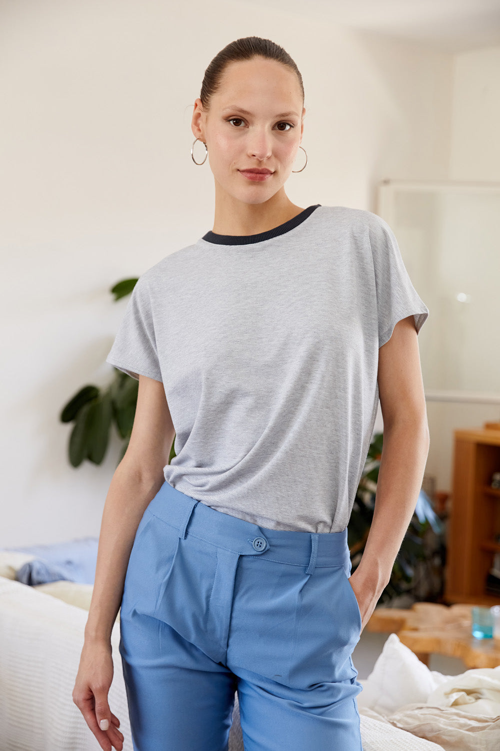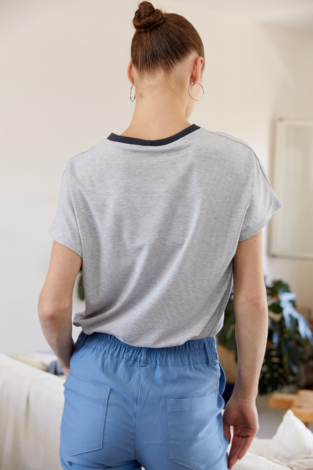 לחולצה גיזרה ישרה ורחוקה מהגוף עם צווארון ריב מעוגל.