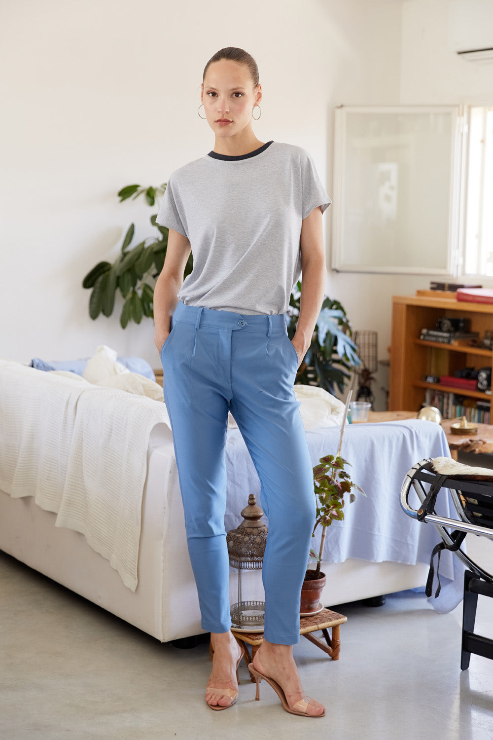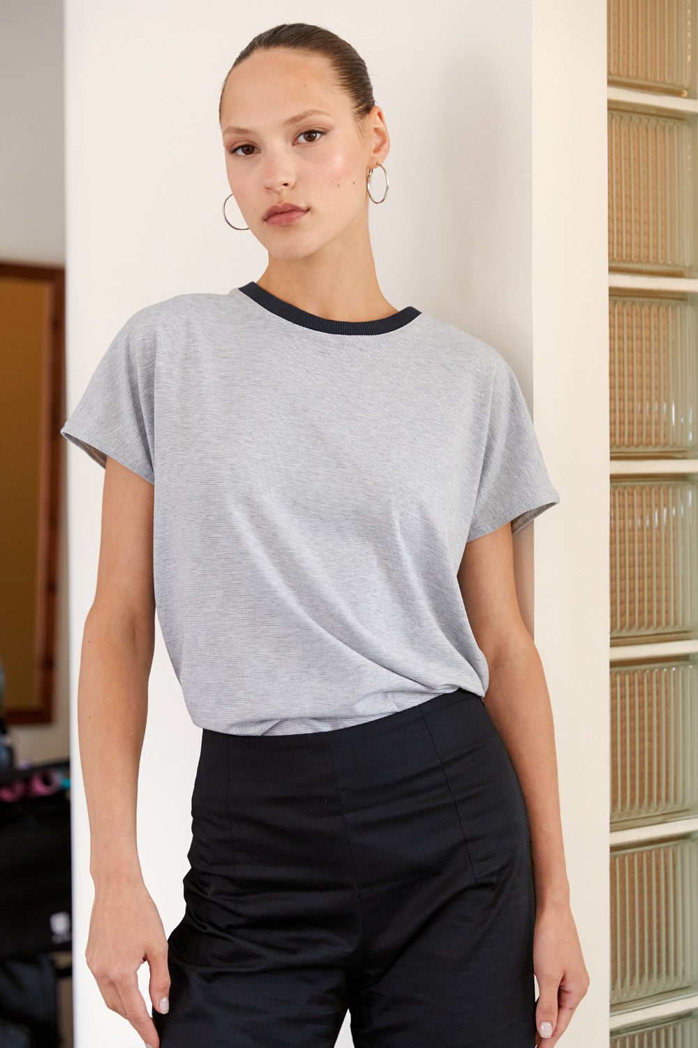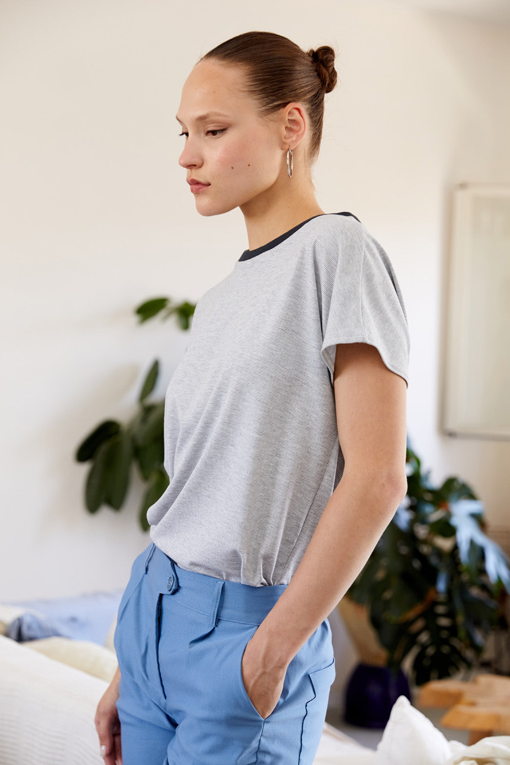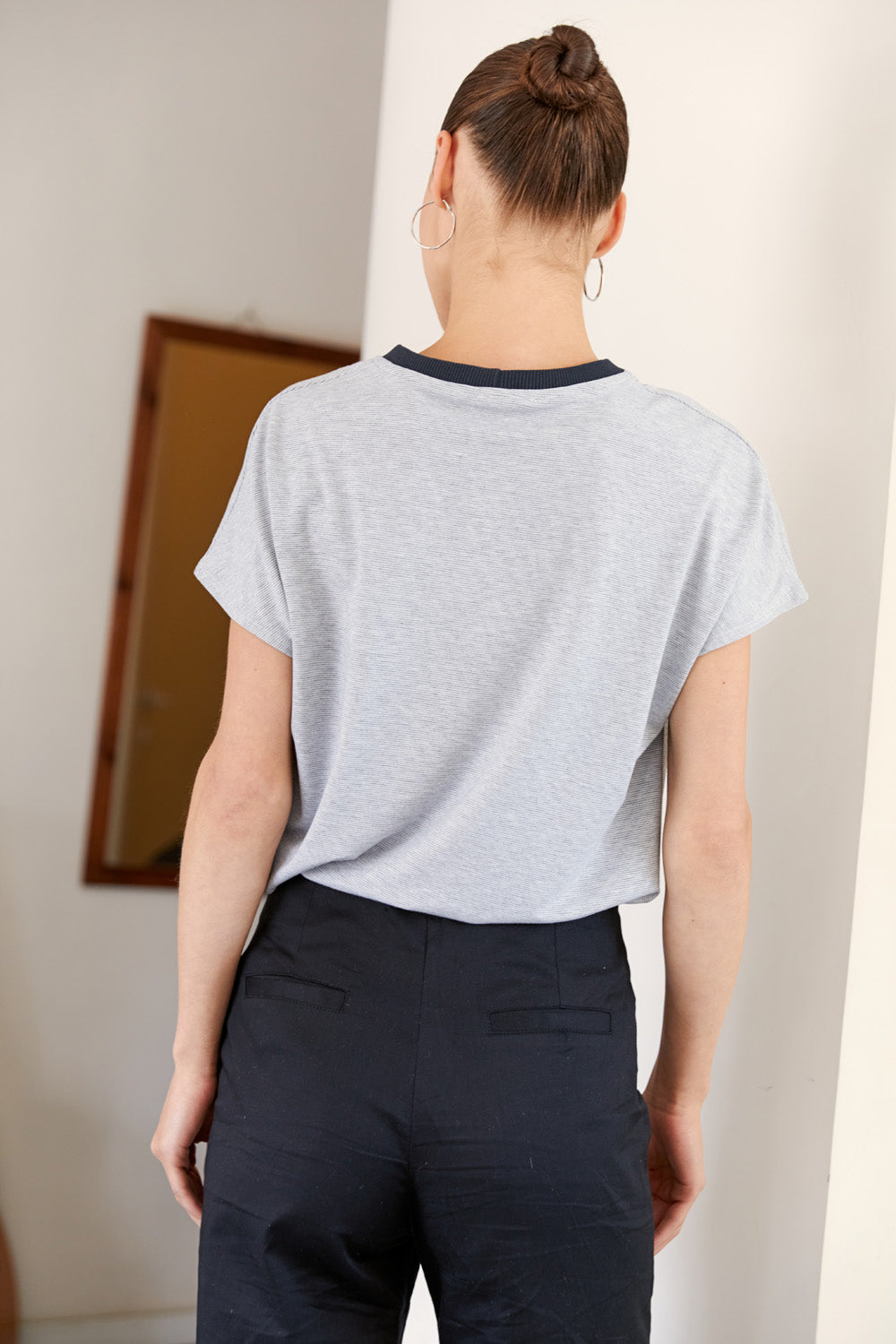 לחולצה גיזרה ישרה ורחוקה מהגוף עם צווארון ריב מעוגל.