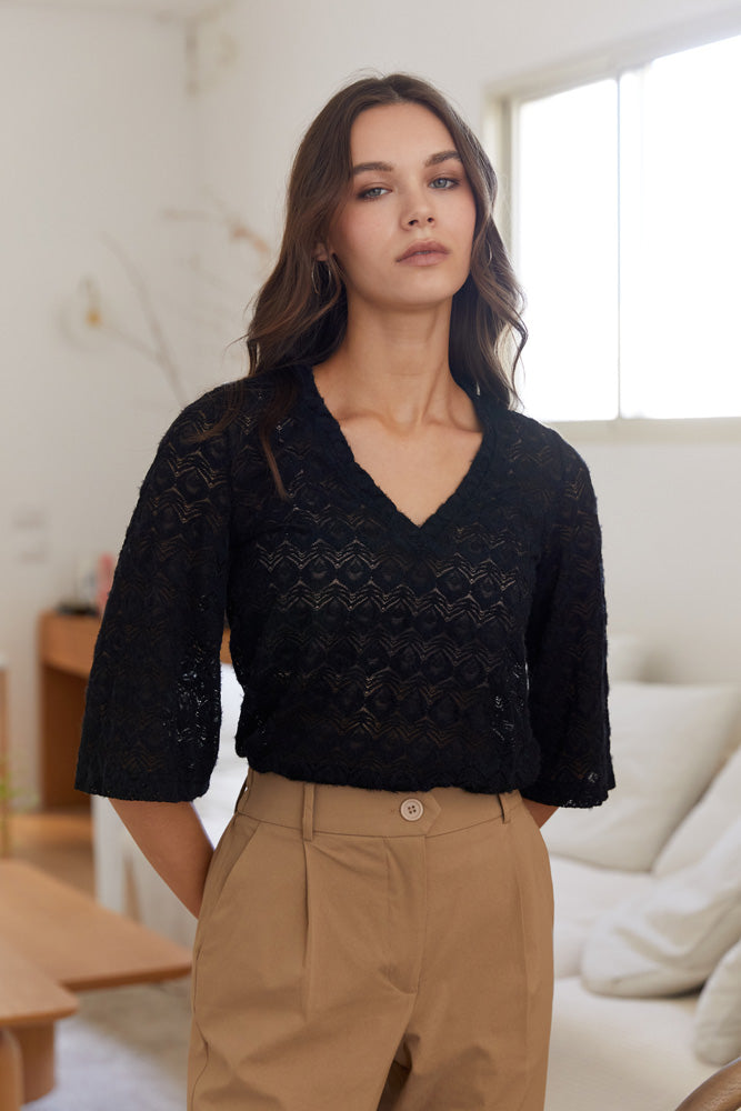 חולצת מרהיבה מבד תחרה יפיפה בעלת שרוולי פעמון באורך מרפק